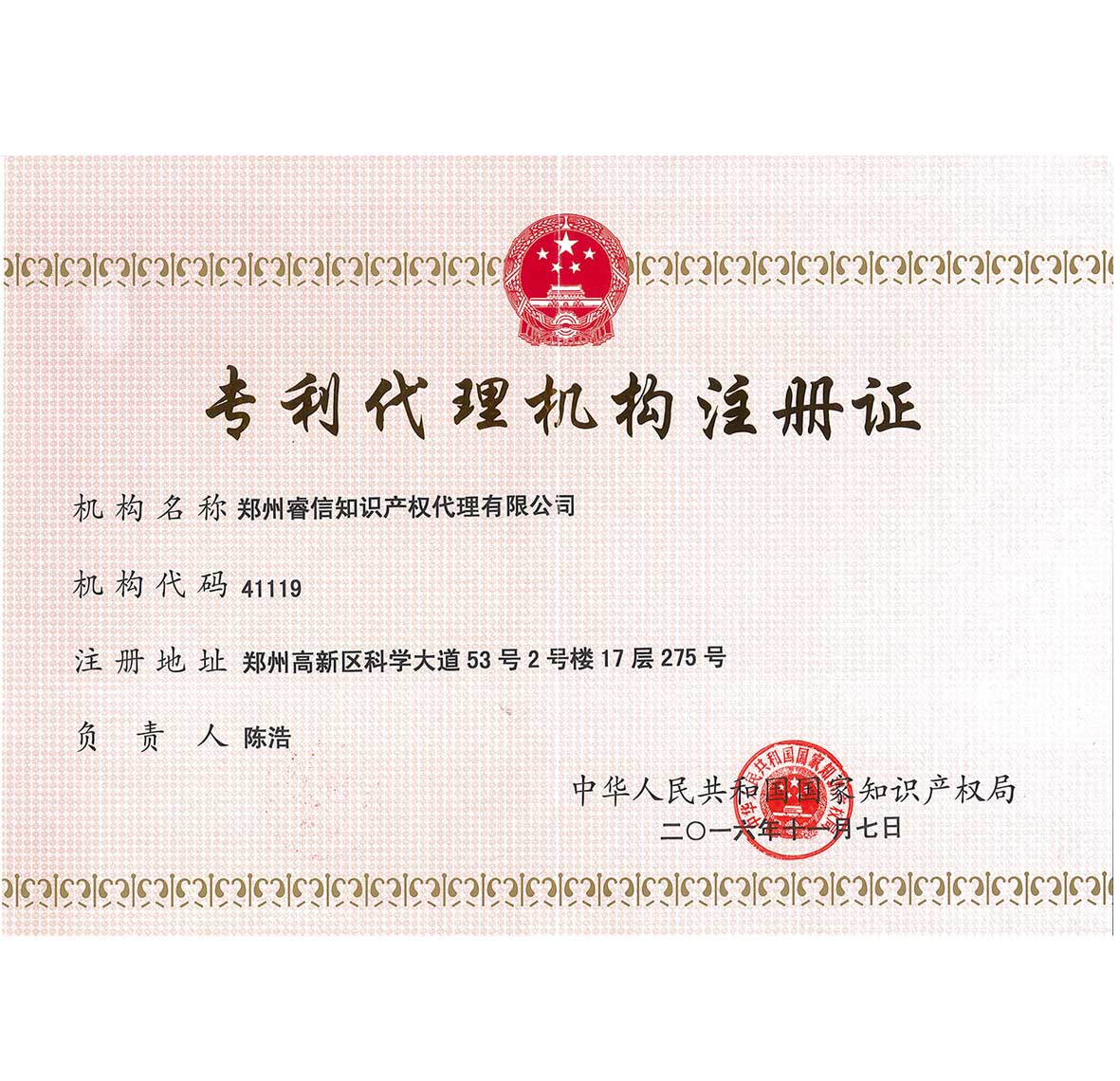 公司陳浩總經(jīng)理被評為“2016年度五星級專利代理人”。
